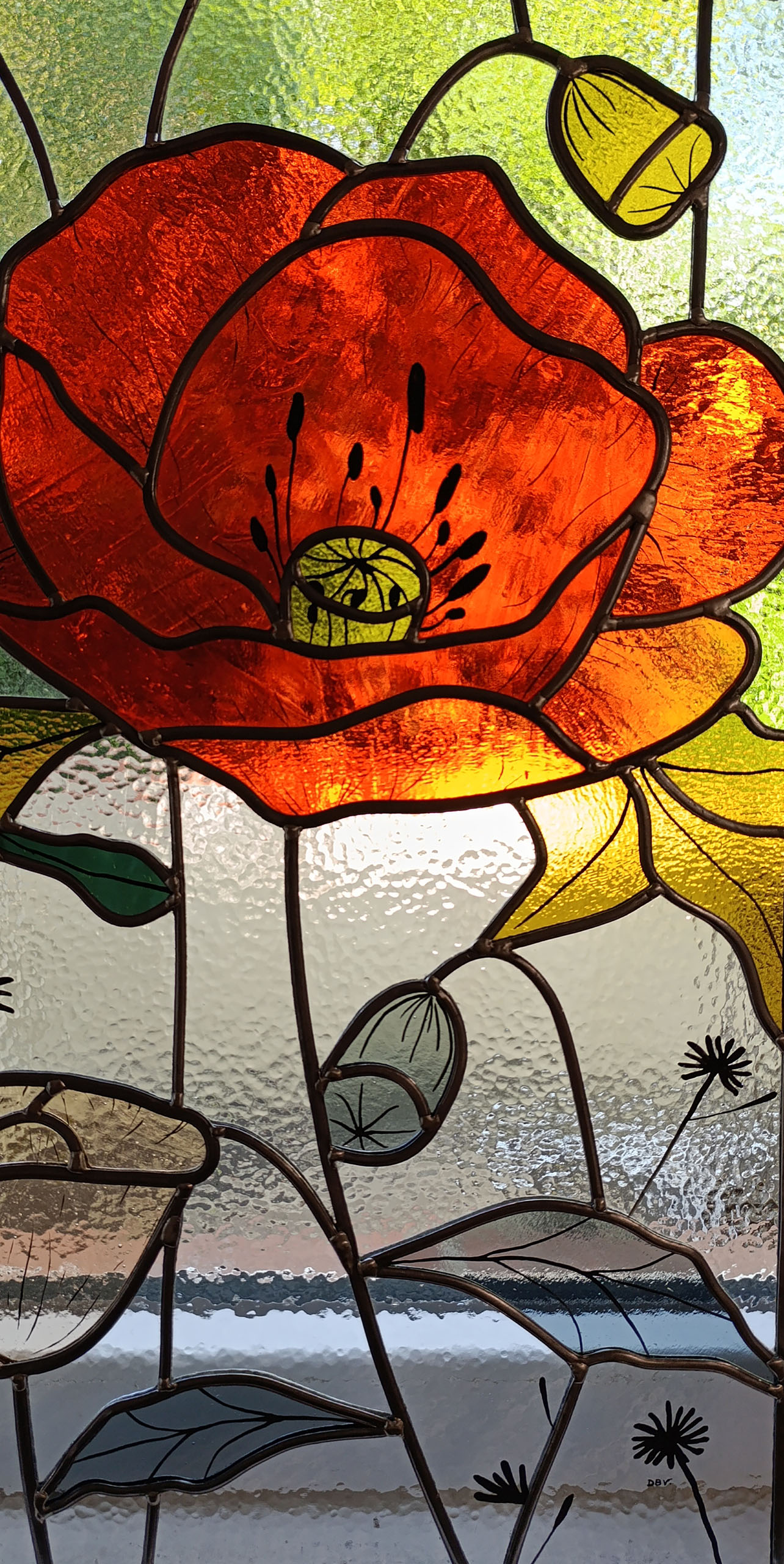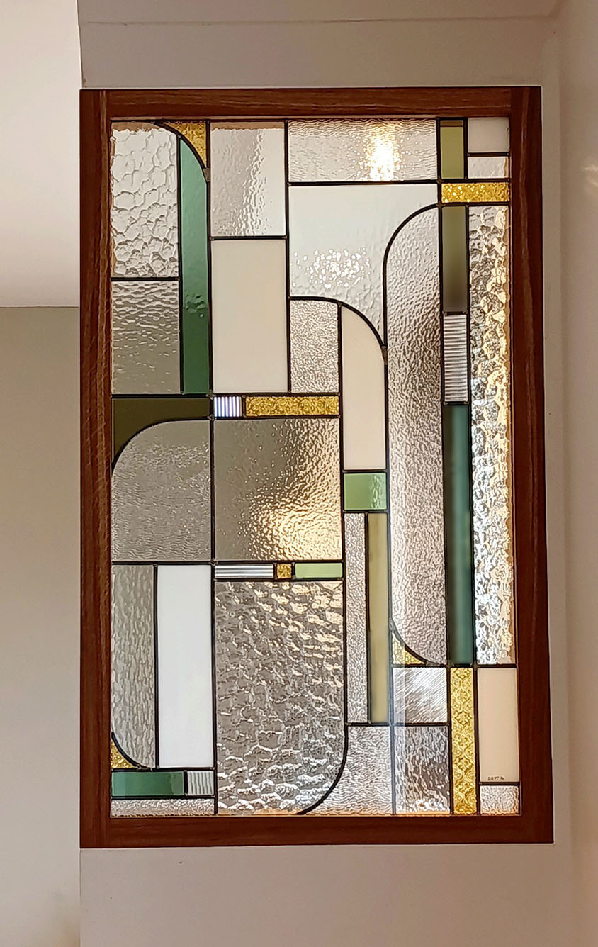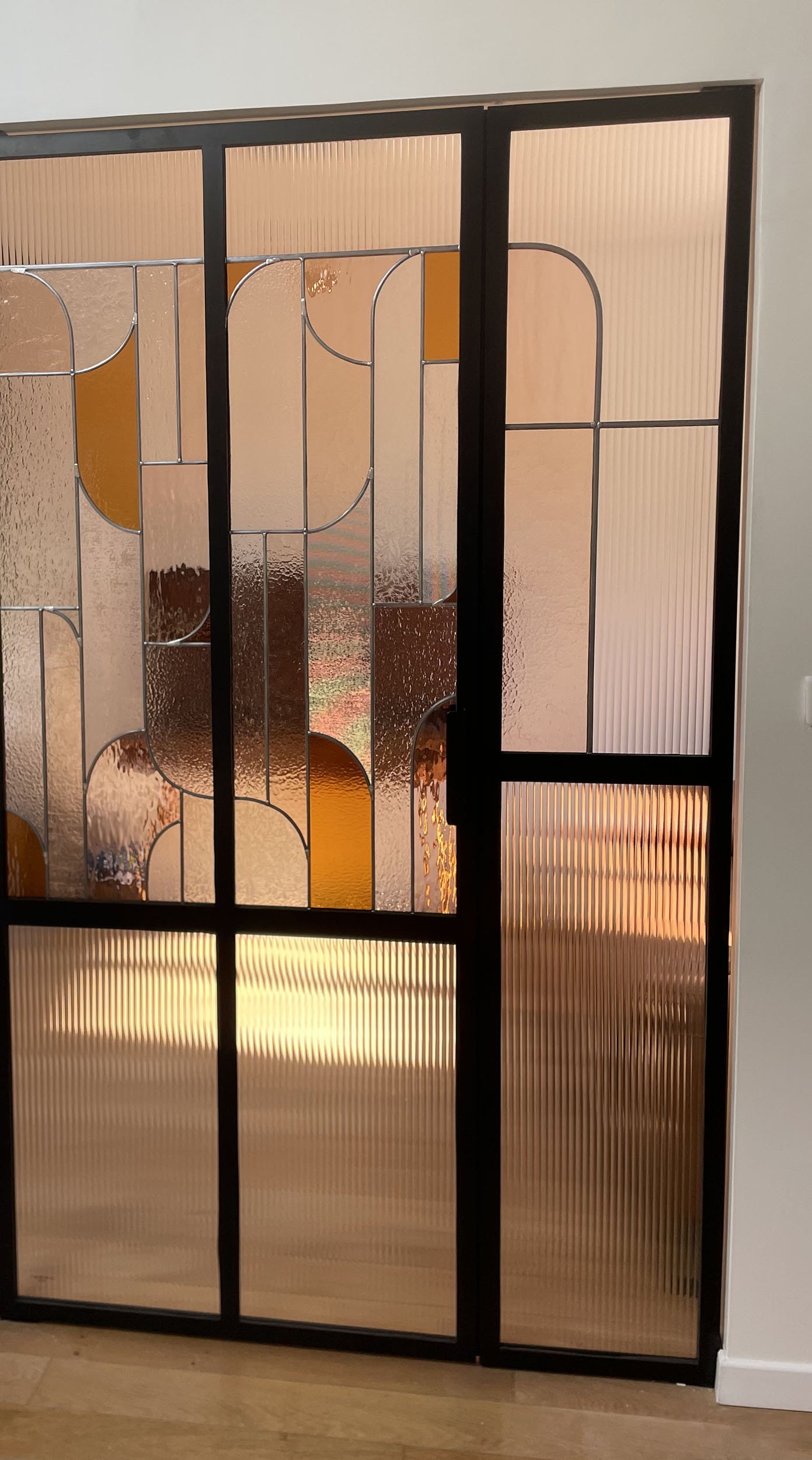 De nombreuses possibilités : Verrière – Vitrail incéré dans un double vitrage, dans une verrière, posé sur une fenêtre, mur vitrail, puit de jour, parois douche…