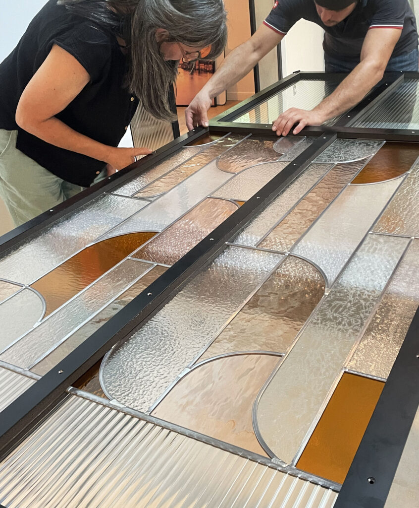 cadrage sur les deux montants vitrés d'une porte où sont en train d'être posés des vitraux sertis au plomb. 1 carreau de couleur dans les angles extérieurs, le reste est en verre clair opalescent séparé par une petite bande de couleur clair différente à la verticale et à l'horizontale.