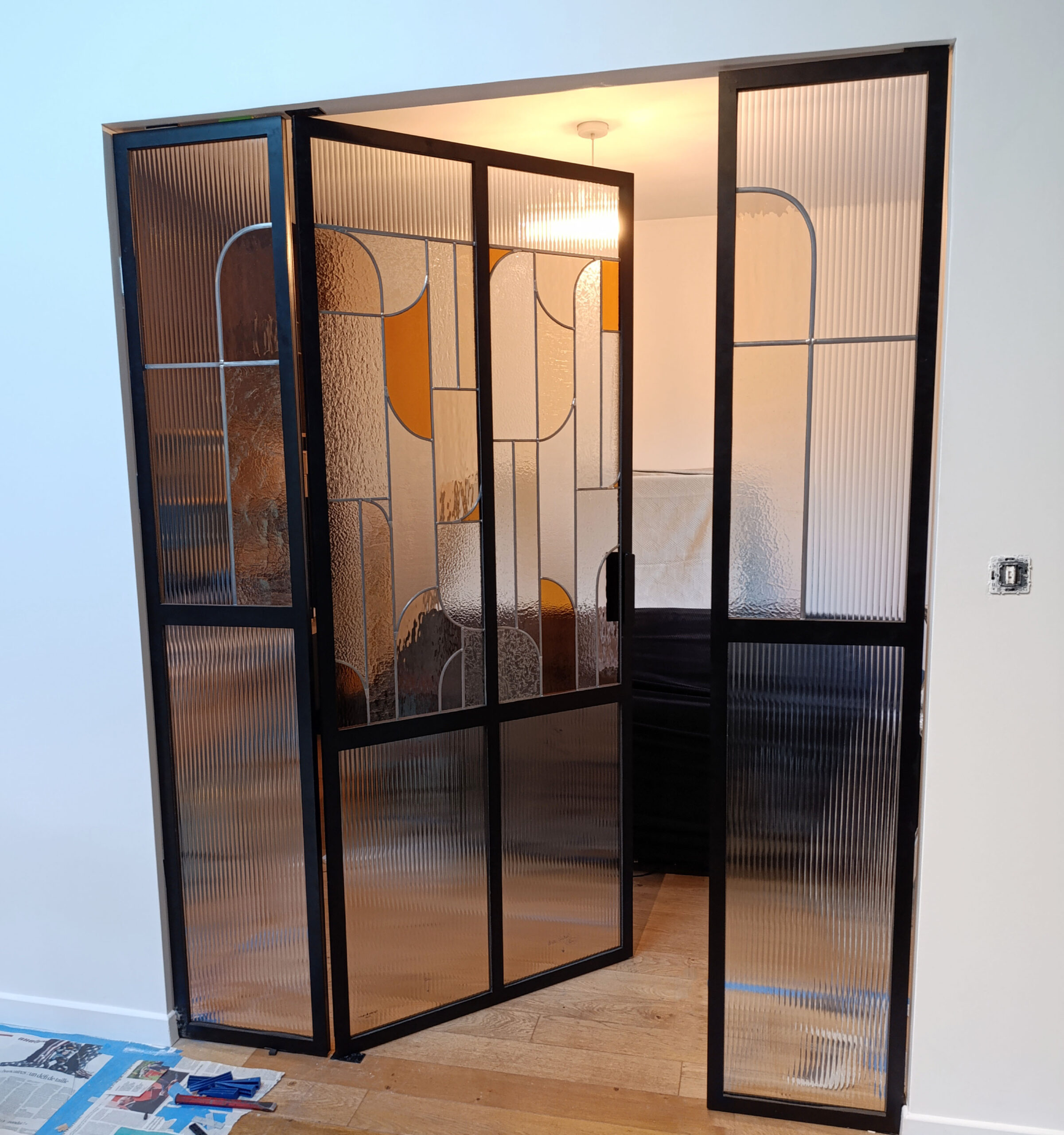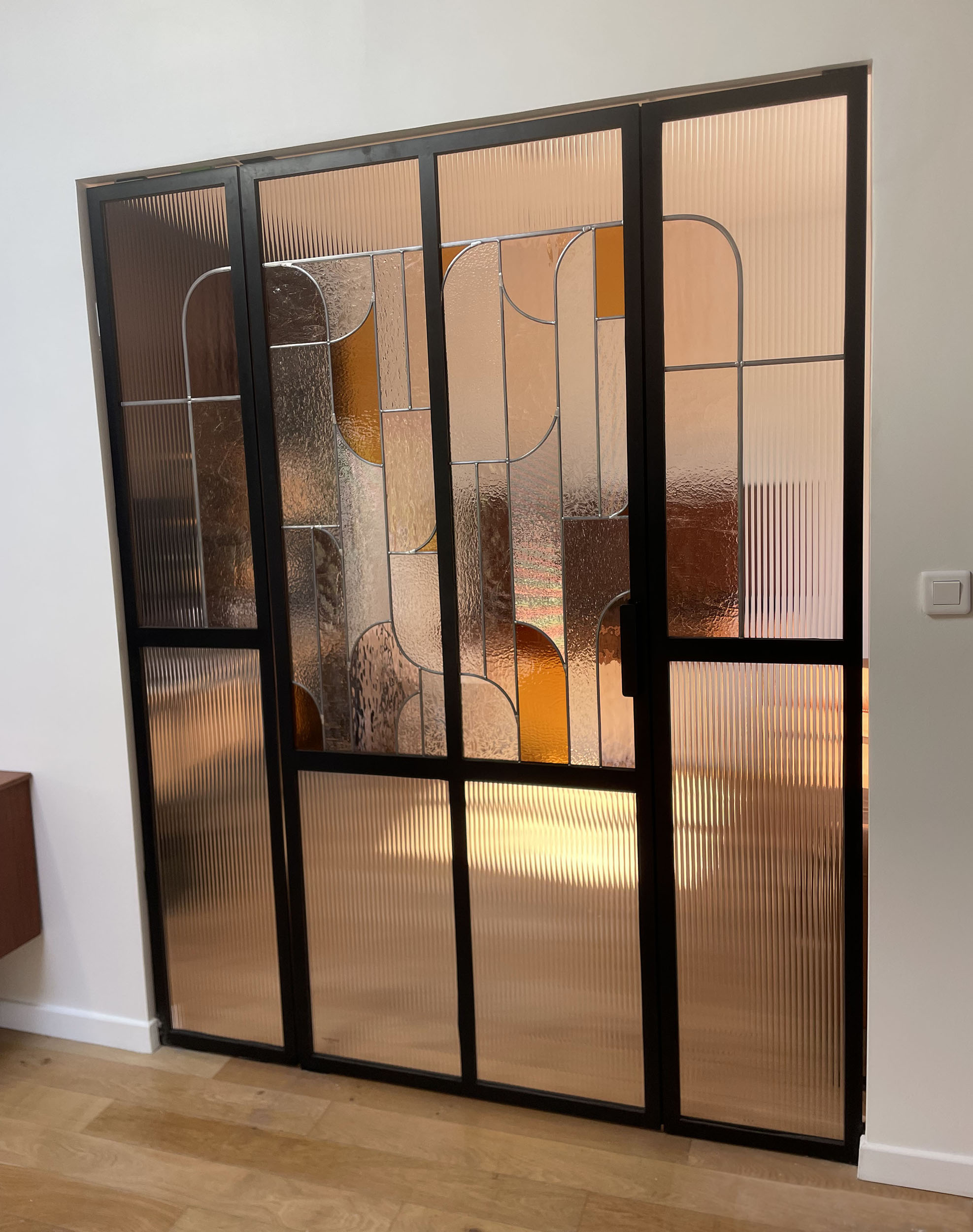 Cette verrière de plus de 2 mètres carrés aux lignes délicates se compose de profilés acier très fins thermolaqués en noir et de vitraux.